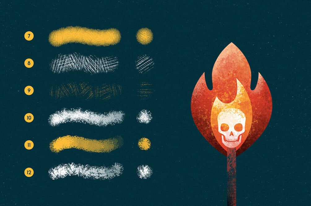 The set of 12 brushes in a Procreate format to get you completely packed with brush variants. Each of them has its own special nature, allowing to make a shadow, rough edges or noisy elements of your image. The worn effect, achievable with these Procreate brushes looks realistic with a little bit of vintage. Now you can go on creating illustrations for posters, flyers, commercials, branding projects, and stationery without any design app restraints!